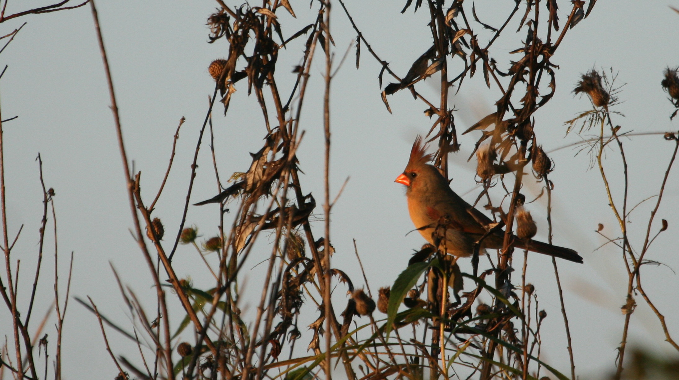 A female cardinal watches the sunrise. A sparrow peeks out at me. A mockingbird takes aim at a starling and takes over the fencepost. Click on pictures to enlarge.