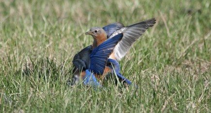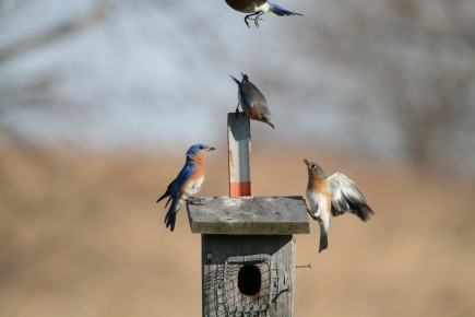 I stopped to watch some bluebirds yesterday and observed two males and two females having what looked like a “bluebird smack-down.” I think they might have been fighting over a nest box, but of course, I wouldn’t know. At one point the males were wrestling on the ground and one of the females dived in. It was pretty amazing to watch. I am very happy to report that it looked like no one was hurt. Click on pictures to enlarge.